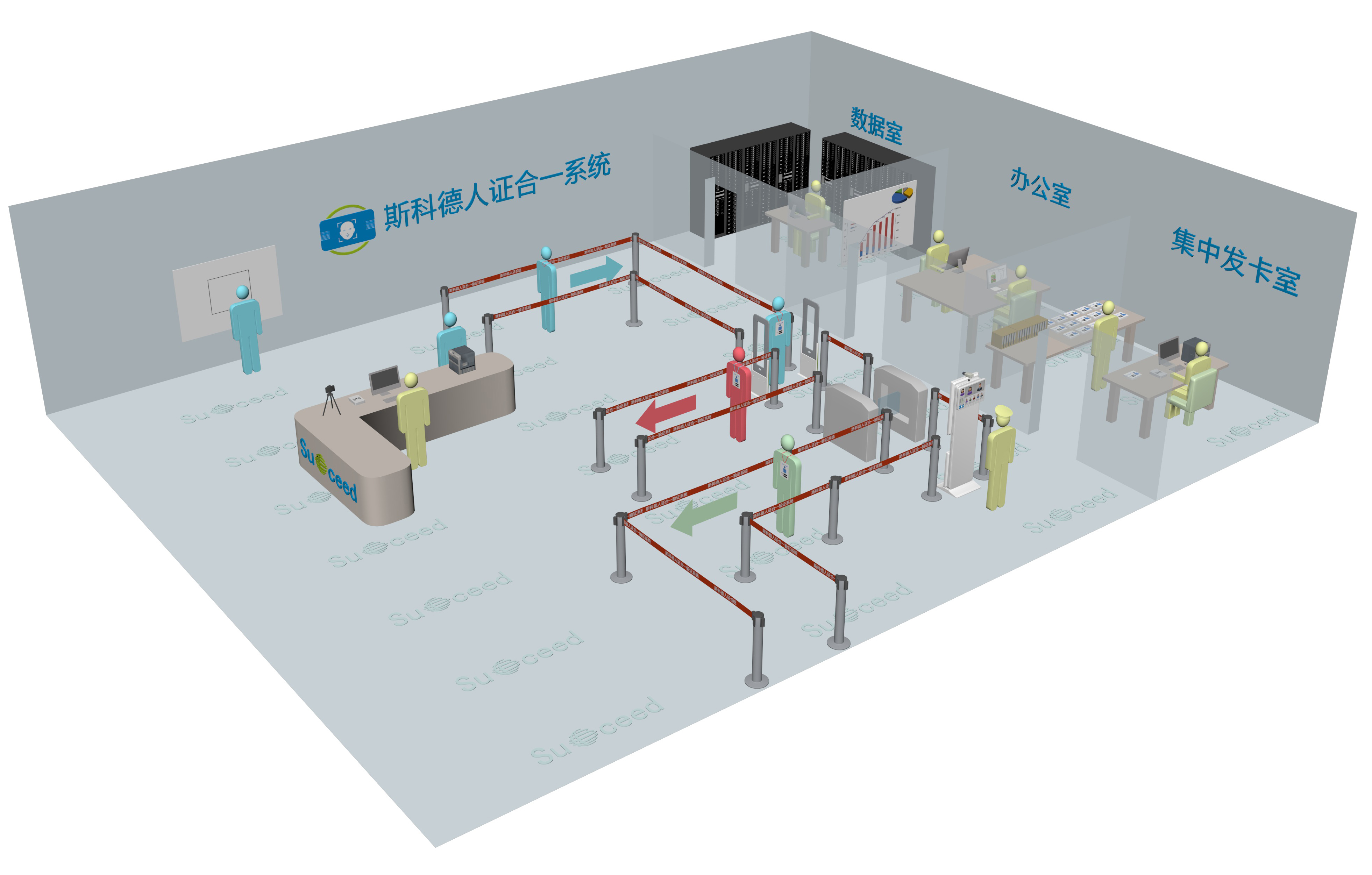 第一种:无障碍快速通行方式,即使用无障碍通道配合斯科德人证合一验证机(一种能刷卡且人脸识别比对的迎宾机)对行进中的人流进行快速验证和人脸比对。布局如下:
