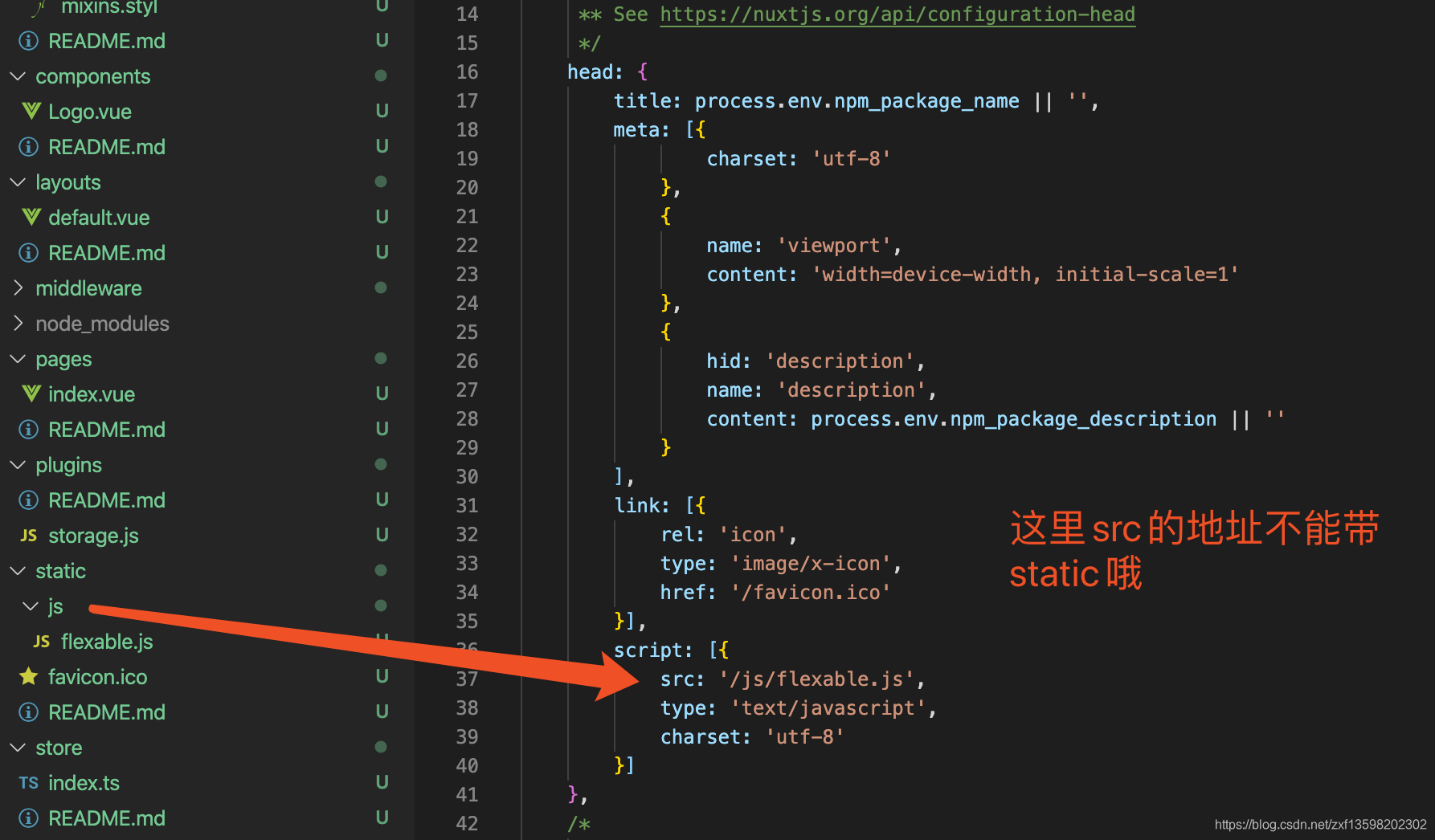 将下载好的 js 放入 static中,或者别的地方, 然后在 nuxt.config.js 的head中配置如下