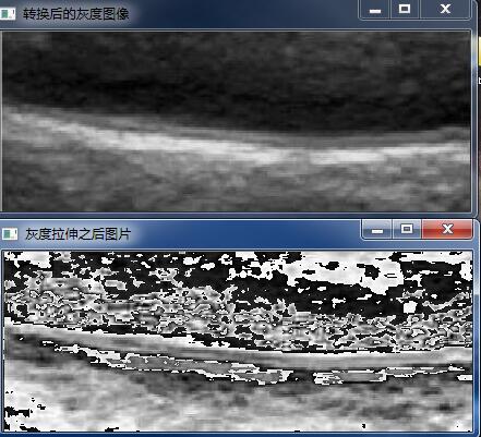 void HistD(cv::Mat &image){int table[256] = { 0 };int nr = image.rows;int nc =image.cols*image.channels();int x1 = 30, y1 = 550, x2 = 200, y2 = 70;for(int j =0;j<nr;j++){uchar * data =image.ptr<uchar>(j);for(int i=0;i<nc;i++){if (data[i]<x1){data[i] = y1/x1 *data[i];}else if (data[i]<x2 ){data[i] = (y2-y1)/(x2-x1)*(data[i] -x1)+y1;}else{data[i] = (255-y2)/(255-x2)*(data[i] -x2)+y2;}}}imshow("灰度拉伸之后图片", image);