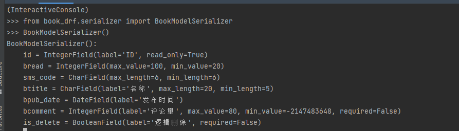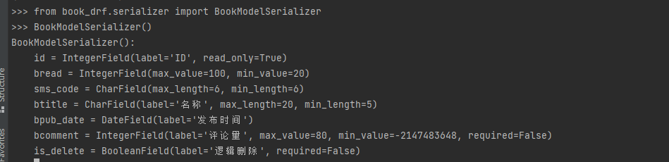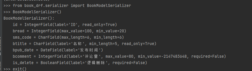 class BookModelSerializer(serializers.ModelSerializer):# 显示指明字段,bread = serializers.IntegerField(max_value=100, min_value=20)sms_code = serializers.CharField(max_length=6, min_length=6)class Meta:model = BookInfo # 指定生成字段的模型类# fields = ('btitle', 'bread') # 指定模型类中的字段# fields = '__all__' # 指定模型类中的字段exclude =('btitle',) # 取反操作,除了这个字段外的其他字段都生成