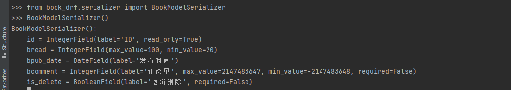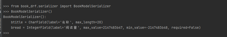 class BookModelSerializer(serializers.ModelSerializer):class Meta:model = BookInfo # 指定生成字段的模型类fields = ('btitle', 'bread') # 指定模型类中的字段