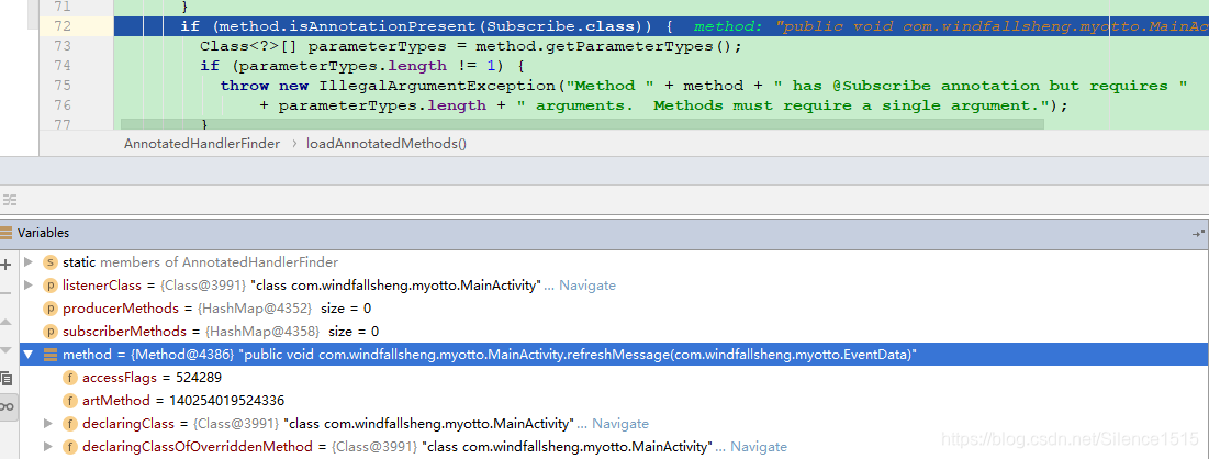 .......省略.........private static void loadAnnotatedProducerMethods(Class<?> listenerClass,Map<Class<?>, Method> producerMethods) {Map<Class<?>, Set<Method>> subscriberMethods = new HashMap<Class<?>, Set<Method>>();loadAnnotatedMethods(listenerClass, producerMethods, subscriberMethods);}/*** Load all methods annotated with {@link Produce} or {@link Subscribe} into their respective caches for the* specified class.*/private static void loadAnnotatedMethods(Class<?> listenerClass,Map<Class<?>, Method> producerMethods, Map<Class<?>, Set<Method>> subscriberMethods) { // 传入的参数: 图1for (Method method : listenerClass.getDeclaredMethods()) {// The compiler sometimes creates synthetic bridge methods as part of the// type erasure process. As of JDK8 these methods now include the same// annotations as the original declarations. They should be ignored for// subscribe/produce.// 如果桥接方法,则不处理if (method.isBridge()) {continue;}// 判断方法是否以@Subscribe为注解if (method.isAnnotationPresent(Subscribe.class)) {Class<?>[] parameterTypes = method.getParameterTypes();// 方法的参数类型的数量只能有1个,否则抛出异常if (parameterTypes.length != 1) {throw new IllegalArgumentException("Method " + method + " has @Subscribe annotation but requires "+ parameterTypes.length + " arguments. Methods must require a single argument.");}Class<?> eventType = parameterTypes[0];if (eventType.isInterface()) {throw new IllegalArgumentException("Method " + method + " has @Subscribe annotation on " + eventType+ " which is an interface. Subscription must be on a concrete class type.");}// 方法的访问修饰符必须是public;if ((method.getModifiers() & Modifier.PUBLIC) == 0) {throw new IllegalArgumentException("Method " + method + " has @Subscribe annotation on " + eventType+ " but is not 'public'.");}Set<Method> methods = subscriberMethods.get(eventType);if (methods == null) {methods = new HashSet<Method>();subscriberMethods.put(eventType, methods);}methods.add(method);// 判断方法是否以@Produce为注解} else if (method.isAnnotationPresent(Produce.class)) {Class<?>[] parameterTypes = method.getParameterTypes();if (parameterTypes.length != 0) {throw new IllegalArgumentException("Method " + method + "has @Produce annotation but requires "+ parameterTypes.length + " arguments. Methods must require zero arguments.");}// 方法的必须要有返回参数;if (method.getReturnType() == Void.class) {throw new IllegalArgumentException("Method " + method+ " has a return type of void. Must declare a non-void type.");}Class<?> eventType = method.getReturnType();if (eventType.isInterface()) {throw new IllegalArgumentException("Method " + method + " has @Produce annotation on " + eventType+ " which is an interface. Producers must return a concrete class type.");}if (eventType.equals(Void.TYPE)) {throw new IllegalArgumentException("Method " + method + " has @Produce annotation but has no return type.");}// 方法的访问修饰符必须是public;if ((method.getModifiers() & Modifier.PUBLIC) == 0) {throw new IllegalArgumentException("Method " + method + " has @Produce annotation on " + eventType+ " but is not 'public'.");}if (producerMethods.containsKey(eventType)) {throw new IllegalArgumentException("Producer for type " + eventType + " has already been registered.");}producerMethods.put(eventType, method);}}PRODUCERS_CACHE.put(listenerClass, producerMethods);SUBSCRIBERS_CACHE.put(listenerClass, subscriberMethods);}.......省略.........