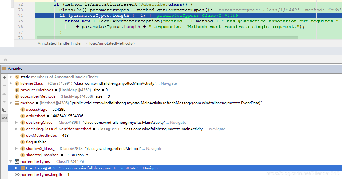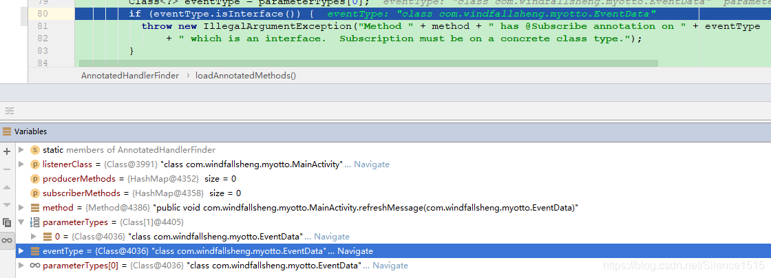 EventHandler 对象创建时注入的参数 new EventHandler(listener, m);listener 是 MainActivity的Class对象,m 是 Subscribe注释方法 refreshMessage(EventData eventData)方法;