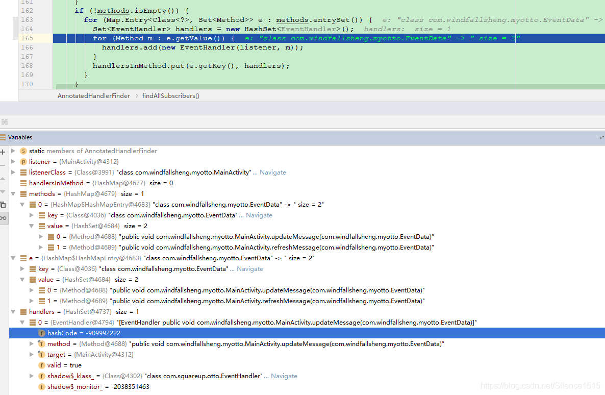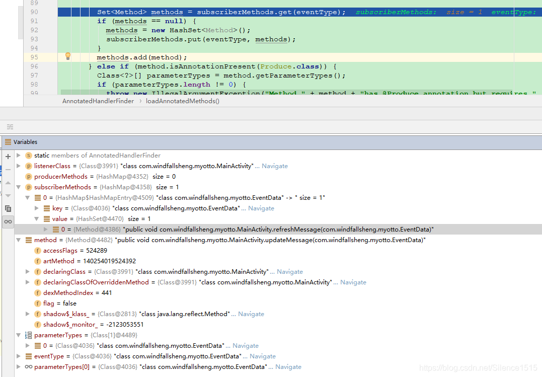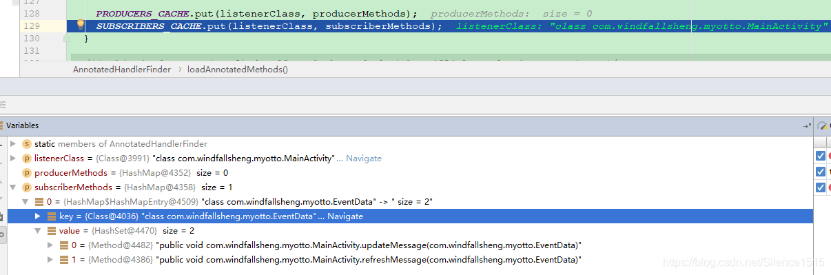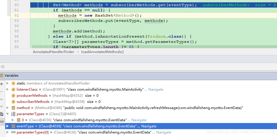 final class AnnotatedHandlerFinder {/** Cache event bus producer methods for each class. */private static final ConcurrentMap<Class<?>, Map<Class<?>, Method>> PRODUCERS_CACHE =new ConcurrentHashMap<Class<?>, Map<Class<?>, Method>>();/** Cache event bus subscriber methods for each class. */private static final ConcurrentMap<Class<?>, Map<Class<?>, Set<Method>>> SUBSCRIBERS_CACHE =new ConcurrentHashMap<Class<?>, Map<Class<?>, Set<Method>>>();.......省略........../** This implementation finds all methods marked with a {@link Produce} annotation. */static Map<Class<?>, EventProducer> findAllProducers(Object listener) { // listener 就是示例代码中的 MainActivity 的实例对象// final Class<?> listenerClass = listener.getClass();Map<Class<?>, EventProducer> handlersInMethod = new HashMap<Class<?>, EventProducer>();// 此时缓存中还没有,methods集合为null;Map<Class<?>, Method> methods = PRODUCERS_CACHE.get(listenerClass);if (null == methods) {methods = new HashMap<Class<?>, Method>();loadAnnotatedProducerMethods(listenerClass, methods);}// 因为当前MainActivity里只有Subject注解的方法,所在这个集合大小是0;if (!methods.isEmpty()) {for (Map.Entry<Class<?>, Method> e : methods.entrySet()) {EventProducer producer = new EventProducer(listener, e.getValue());handlersInMethod.put(e.getKey(), producer);}}// 当前这个返回结果集合大小是0;return handlersInMethod;}.......省略..........}