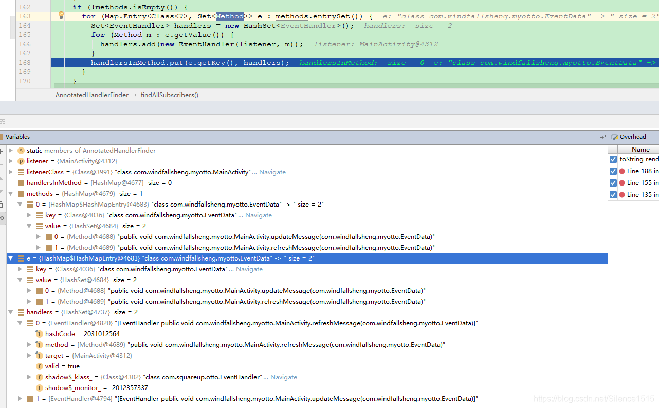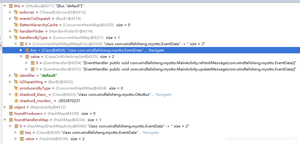 public class Bus{.......省略.......public void register(Object object) {if (object == null) {throw new NullPointerException("Object to register must not be null.");}// 检查线程,如果不是对应的线程则抛异常;默认的构造方法里使用的是主线程;// enforcer 就是构造过程中注入的默认参数 ThreadEnforcer.MAIN;// 它是 ThreadEnforcer 的一个实例,实现的 enforce(Bus bus)方法里会进行线程检查enforcer.enforce(this); // 1// handlerFinder 就是构造过程中注入的默认参数 HandlerFinder.ANNOTATED;// 它是 HandlerFinder 的一个实例,实现了两个方法:findAllProducers(Object listener) 和 findAllSubscribers(Object listener);// findAllProducers(Object listener) 内部调用了 AnnotatedHandlerFinder 的 findAllProducers(Object listener);// 因为 MainActivity 中并没有 @Produce 的注解方法,所以这里返回的map大小是0,相关的逻辑也不再执行,接下来程序就会执行 handlerFinder.findAllSubscribers(object)方法;Map<Class<?>, EventProducer> foundProducers = handlerFinder.findAllProducers(object); // 2.......省略.......// handlerFinder 就是构造过程中注入的默认参数 HandlerFinder.ANNOTATED;// findAllSubscribers(Object listener) 内部调用了 AnnotatedHandlerFinder 的 findAllSubscribers(Object listener);// 这里返回的map是;Map<Class<?>, Set<EventHandler>> foundHandlersMap = handlerFinder.findAllSubscribers(object); // 3for (Class<?> type : foundHandlersMap.keySet()) {Set<EventHandler> handlers = handlersByType.get(type);if (handlers == null) {//concurrent put if absentSet<EventHandler> handlersCreation = new CopyOnWriteArraySet<EventHandler>();handlers = handlersByType.putIfAbsent(type, handlersCreation);if (handlers == null) {handlers = handlersCreation;}}final Set<EventHandler> foundHandlers = foundHandlersMap.get(type);if (!handlers.addAll(foundHandlers)) {throw new IllegalArgumentException("Object already registered.");}}for (Map.Entry<Class<?>, Set<EventHandler>> entry : foundHandlersMap.entrySet()) {Class<?> type = entry.getKey();EventProducer producer = producersByType.get(type);if (producer != null && producer.isValid()) {Set<EventHandler> foundHandlers = entry.getValue();for (EventHandler foundHandler : foundHandlers) {if (!producer.isValid()) {break;}if (foundHandler.isValid()) {dispatchProducerResultToHandler(foundHandler, producer);}}}}}.......省略.......}
