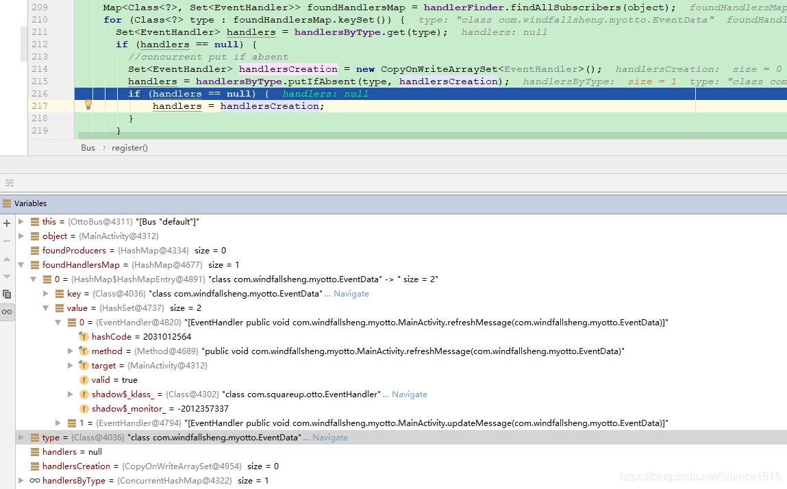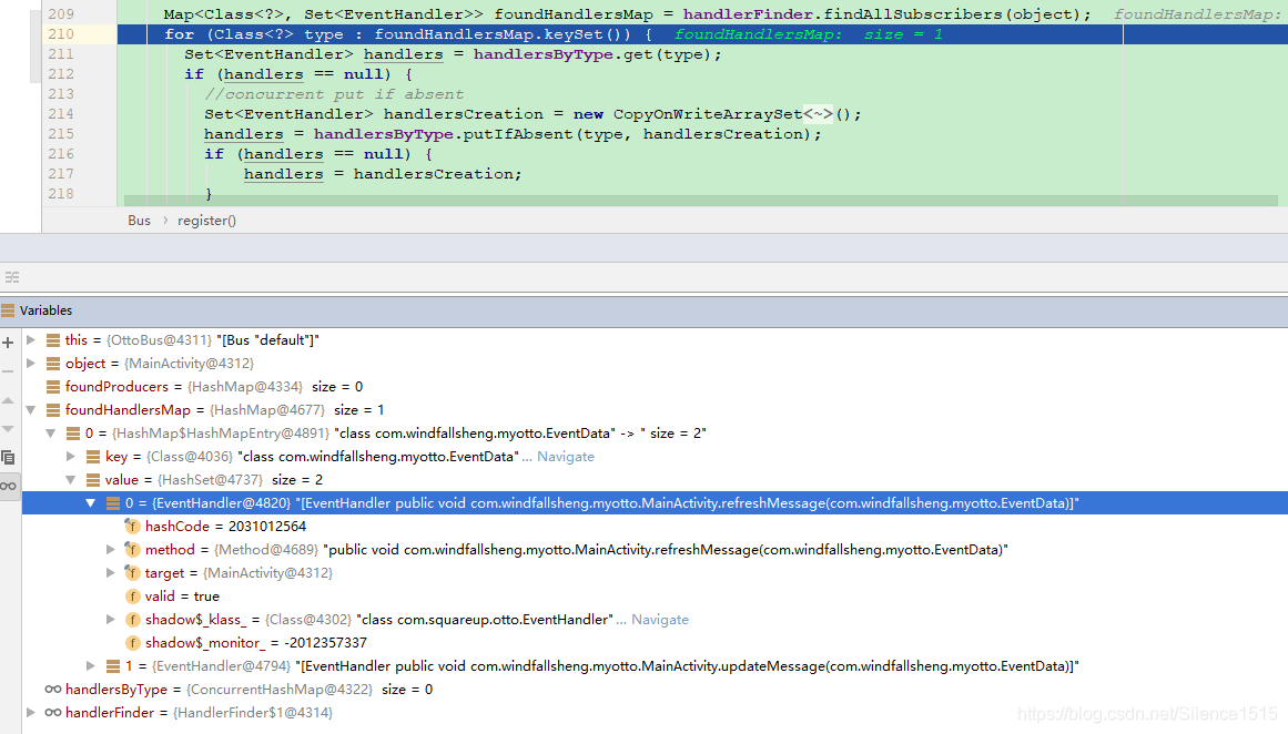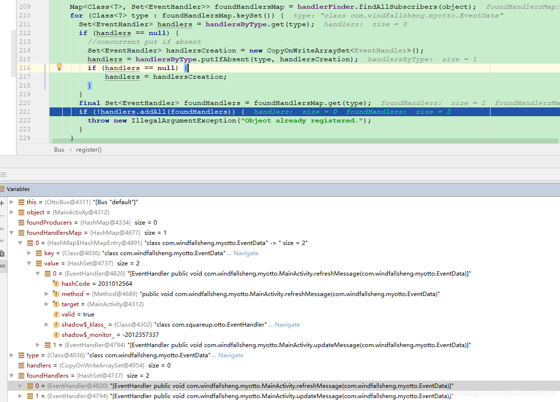 public class Bus{.......省略.......public void register(Object object) {.......省略.......Map<Class<?>, Set<EventHandler>> foundHandlersMap = handlerFinder.findAllSubscribers(object); // 3for (Class<?> type : foundHandlersMap.keySet()) {// 此时handlersByType集合还是0,查找出的结果集合还是null;Set<EventHandler> handlers = handlersByType.get(type);if (handlers == null) {//concurrent put if absentSet<EventHandler> handlersCreation = new CopyOnWriteArraySet<EventHandler>();// 此时key对应的value还不存在,此方法会添加key和value,并且返回nullhandlers = handlersByType.putIfAbsent(type, handlersCreation);if (handlers == null) {// 将 CopyOnWriteArraySet类型的集合对象 handlersCreation 赋值给 handlershandlers = handlersCreation;}}final Set<EventHandler> foundHandlers = foundHandlersMap.get(type);// 如果Set集合发生更改,则返回true。if (!handlers.addAll(foundHandlers)) {throw new IllegalArgumentException("Object already registered.");}}.......省略.......}