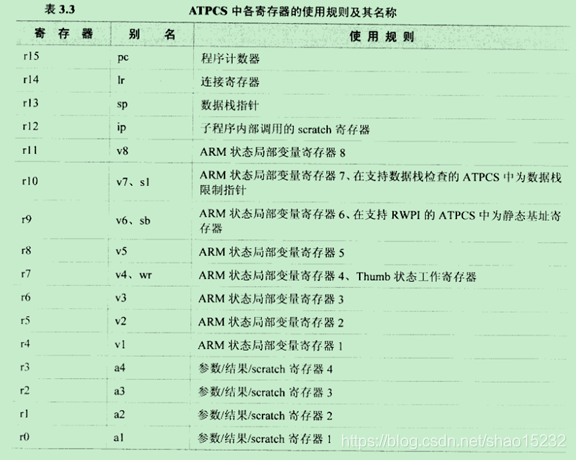 本文主要是介绍ATPCS中各寄存器的使用规则及名称,希望对大家解决编程问题提供一定的参考价值,需要的开发者们随着小编来一起学习吧!