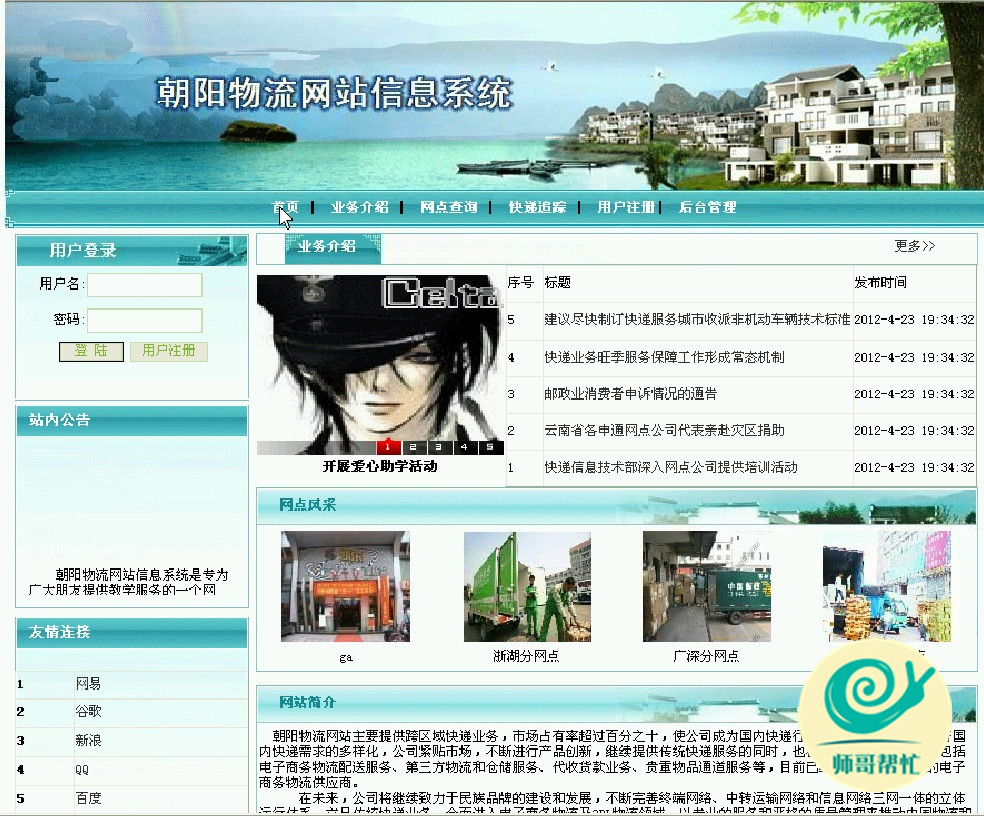 该系统主要实现了管理员在后台对网站信息、行业介绍信息、省市信息管理、网点信息、快递信息的维护;普通用户在网站前台查询各类资讯、快递物流网点和当前快递状态等功能。