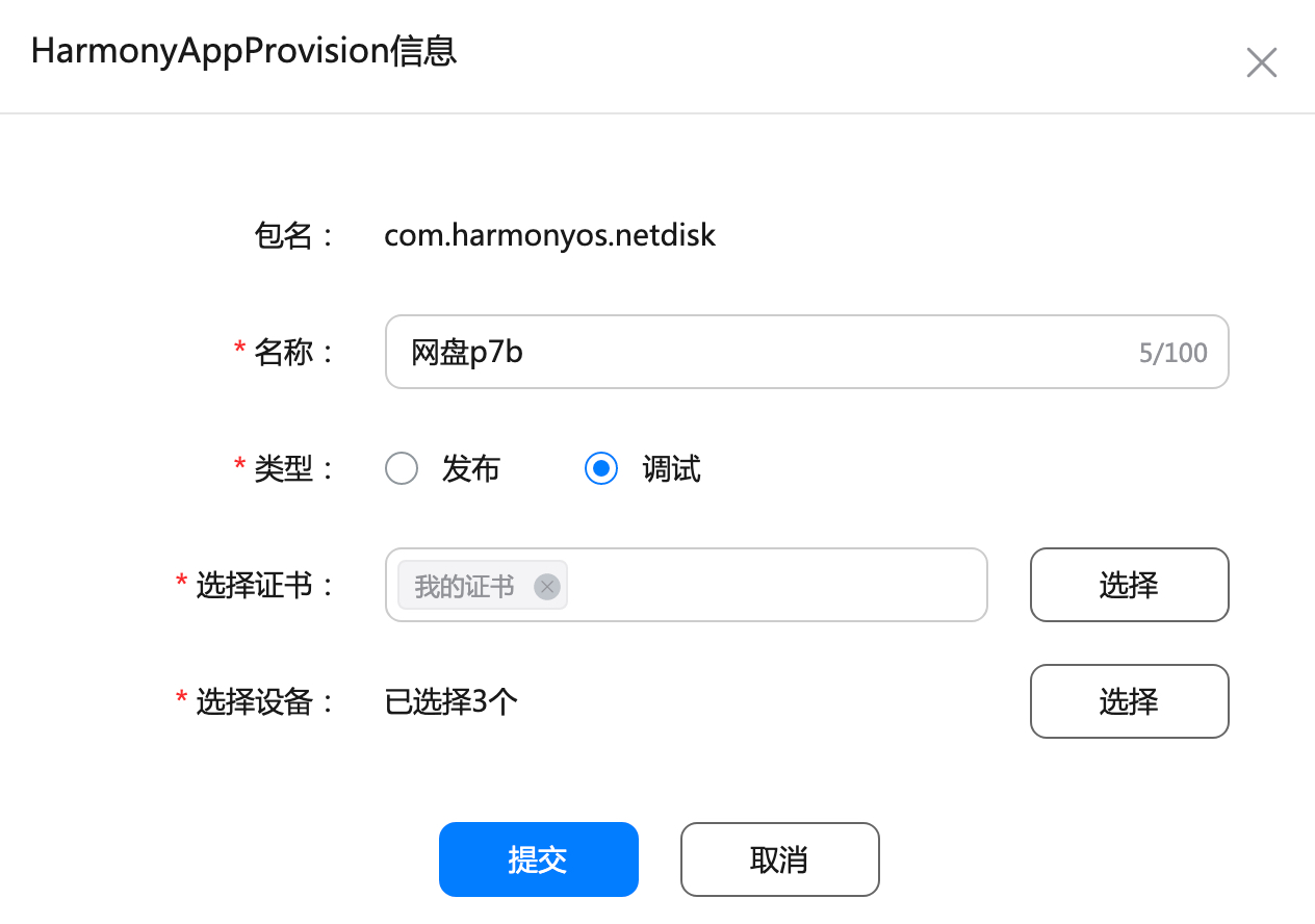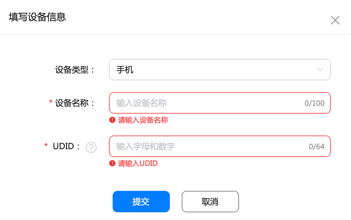 进入该页面后,在左侧导航栏选择“设备管理”,进入设备管理页面。然后点击右侧的“添加设备”按钮,会弹出如图5所示的窗口。这里需要选择设备类型、输入设备名称和UDID,然后点“提交”按钮添加设备。只有在这里添加的设备才能使用起前面申请的证书安装HarmonyOS App。