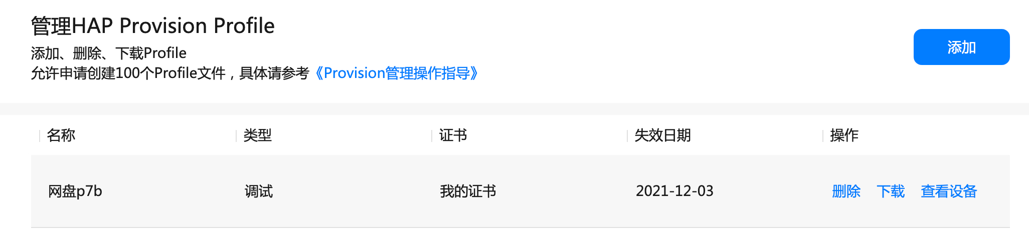 成功添加HAP Provision Profile后,会在列表中显示刚才创建的HAP Provision Profile,如图9所示。点击右侧“下载”链接,就会下载一个名为“网盘p7bDebug.p7b”的文件。