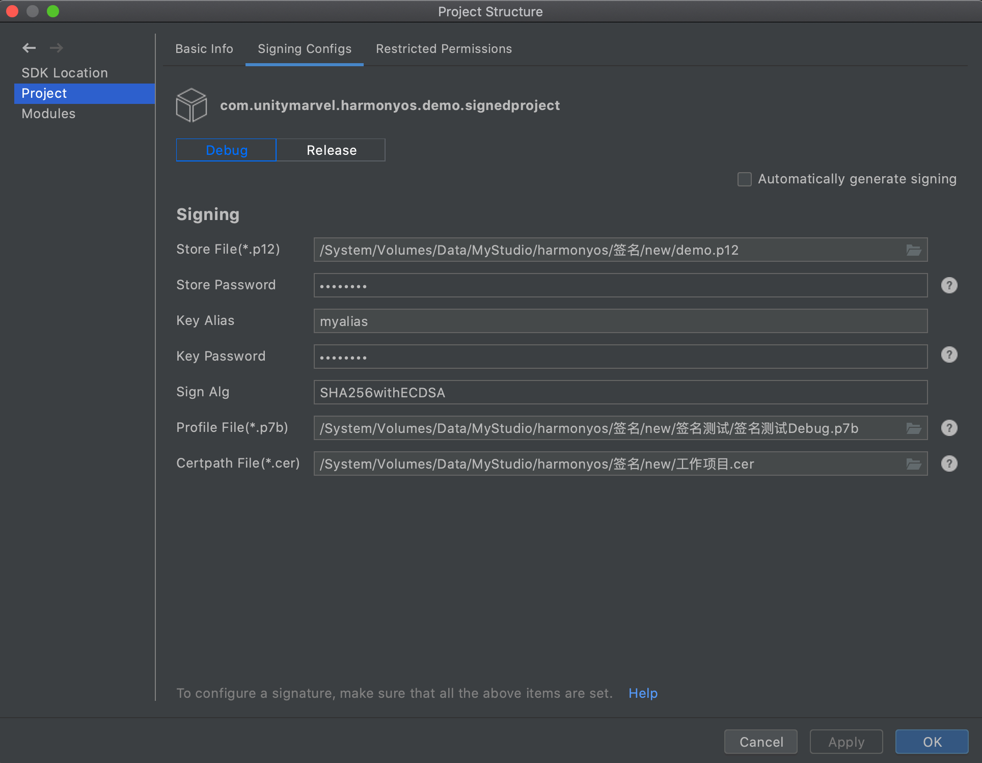 做完上面的几步,就可以打开IDE的Project Structure窗口,并对工程进行前签名,如图11所示。在签名时注意相关文件的选择,不要选错了。其中密码就是前面输入的密码。最后点击OK按钮完成签名。