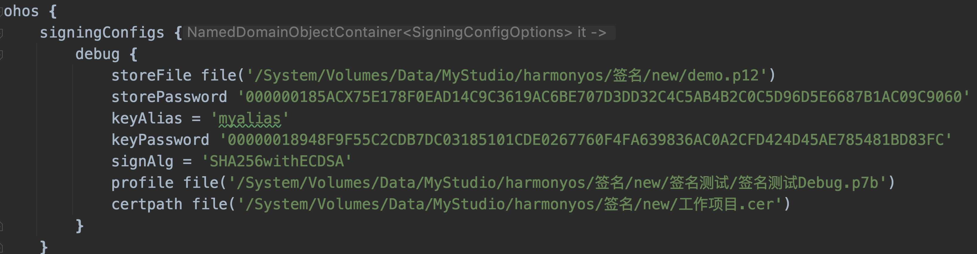 签完名,会在工程的build.gradle文件中出现如图12所示的内容,用于存储签名信息。如果下次再对同一个包签名,可以直接将signingConfigs标签的内容复制到对应工程的build.gradle文件中。