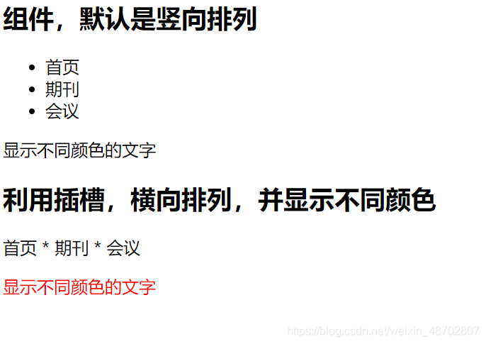 </head><body><div id="app"><h2>组件,默认是竖向排列</h2><cpn></cpn><h2>利用插槽,横向排列,并显示不同颜色</h2><cpn><template v-slot:tracy="slotProps"><p>{{ slotProps.aaa.join(" * ") }}</p><p style="color:red">{{slotProps.bbb}}</p></template></cpn></div><template id="cpnn"><div><slot name="tracy" :aaa="movies" :bbb="p"><ul><li v-for="item in movies">{{item}}</li></ul><p>{{p}}</p></slot></div></template><script>const vue = new Vue({el: '#app',components: {cpn: {template: "#cpnn",data() {return {movies: ["首页", "期刊", "会议"],p: "显示不同颜色的文字"}}}}});</script>