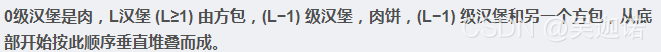 对于一个 L 级汉堡:0级汉堡是肉,L汉堡 (L≥1) 由方包,(L−1) 级汉堡,肉饼,(L−1) 级汉堡和另一个方包,从底部开始按此顺序垂直堆叠而成。