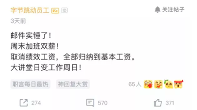 五点半下班,六点半有班车,八点有免费晚餐,十点报销车费;住房补贴、休闲娱乐、无限零食、30 天全薪病假...... 听起来是不是像在做梦? 论福利待遇,BAT 们从没让吃瓜群众失望过。 快手在 1 月份也开始实行大小周制度了,当然,加班的那两天发双倍薪资。为响应快手号召,字节跳动也及时做出调整,表示原来周末加班的 1.2 倍工资上调为双倍,并且取消绩效部份工资,全部改为双倍发放的基本工资,换句话就是全员涨薪 20%!