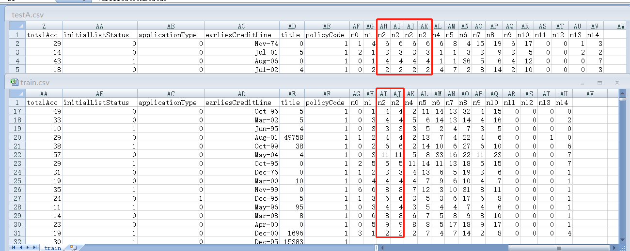 1、首先观察训练集train.csv和testA.csv,将train.csv和testA.csv的shape分别打印出来,发现居然train.shape的列数比testA.shape的列数少两列。这不科学啊~