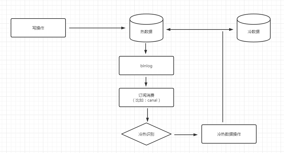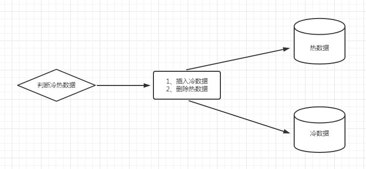 | 缺点 | 1、不能按照时间区分冷热,当数据变为冷数据,期间可能没有进行任何操作 2、需要修改所有数据写操作的业务代码 | 1、不能按照时间区分冷热,当数据变为冷数据,期间没有进行任何操作 2、需要考虑数据并发操作的问题,即业务代码与冷热变更代码同时操作同一数据 | 1、不能做到实时性 |