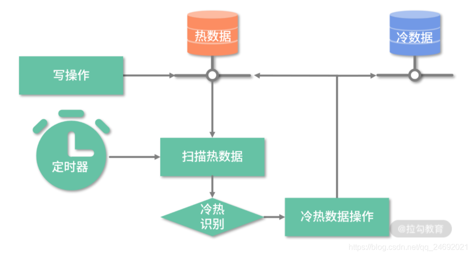 了解了冷热数据的判断逻辑后,我们就要开始考虑如何触发冷热数据分离了。一般来说,冷热数据分离的触发逻辑分 3 种。