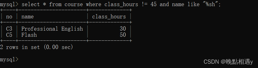 查询课程表中课时数不等于45并且·课程名以“sh”结尾的课程名称、课时数字段数据: