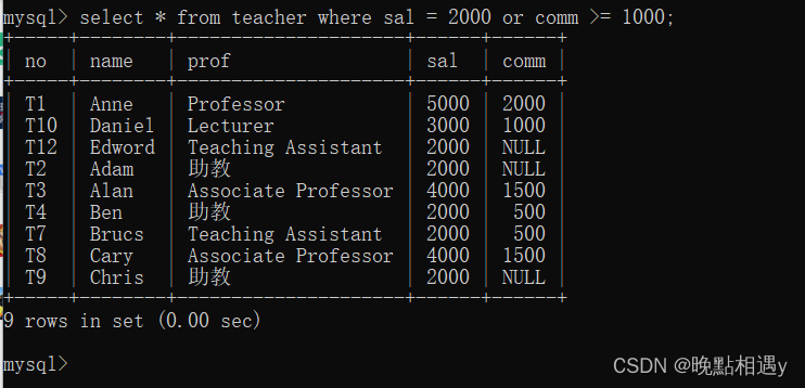 查询教师表中工资等于2000或岗位津贴大于等于1000的教师所有字段数据: