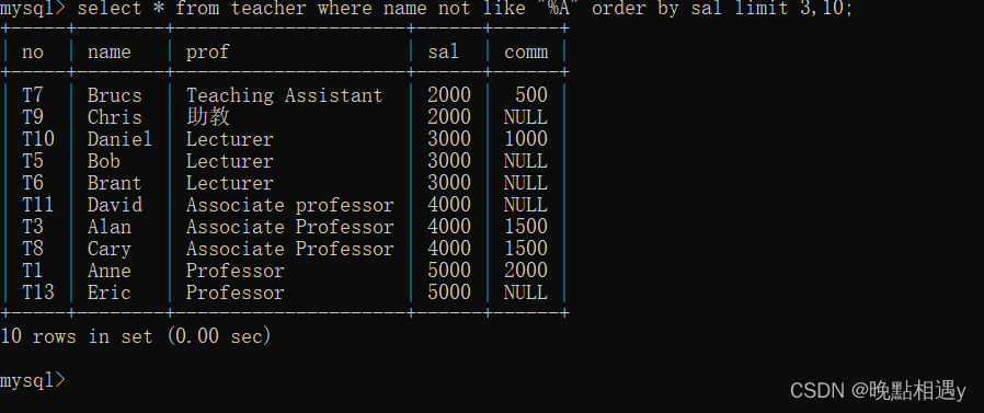 查询教师表中教师姓名不以字母“A”开头的教师所有字段数据,用工资排序,去前三条: