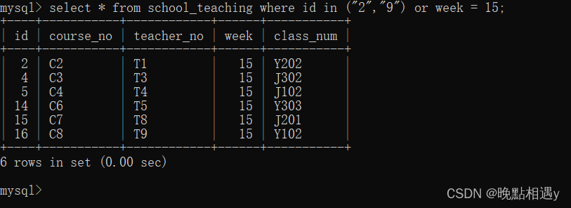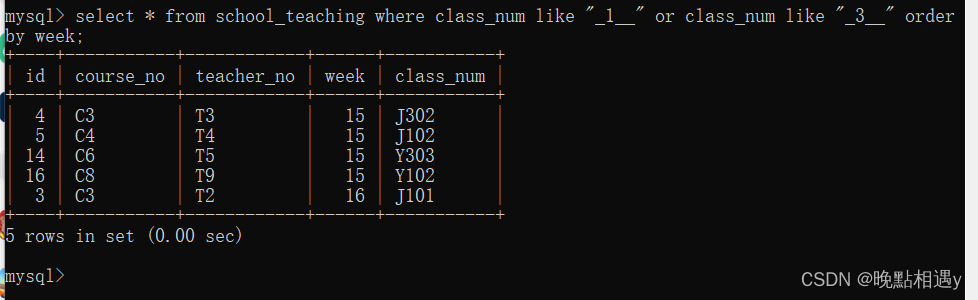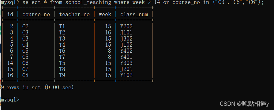 查询授课表中周数大于14或者课程号在C3、C5、C6中所有的字段数据: