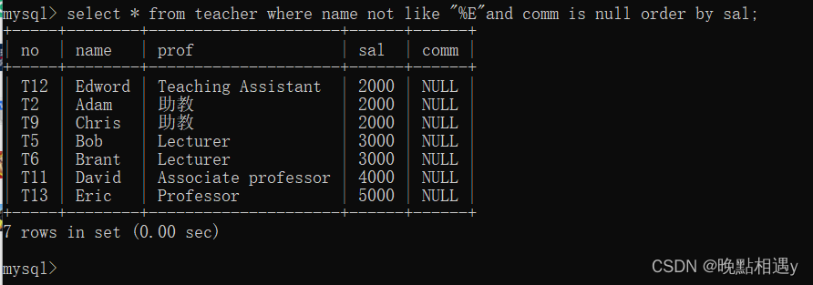查询教师表中教师姓名不以字符“e”开头的并且没有岗位津贴的教师号、教师姓名、工资、岗位津贴字段数据,用工资排序: