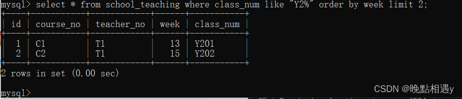 查询授课表中教师号在Y栋2楼的所有课程号、教师号、教室号字段数据,用周数排序,取前两条: