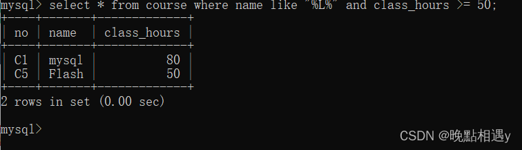 查询课程表中带字母“L”的并且课时数大于等于50的课程名称、课时数字段数据: