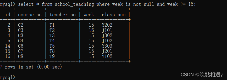 查询授课表中周数不为空并且周数大于等于15的课程号、教室号、周数字段数据: