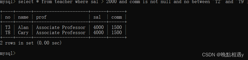 查询教师表中在T2到T9之间工资大于2000并且有岗位津贴的教师所有字段数据: