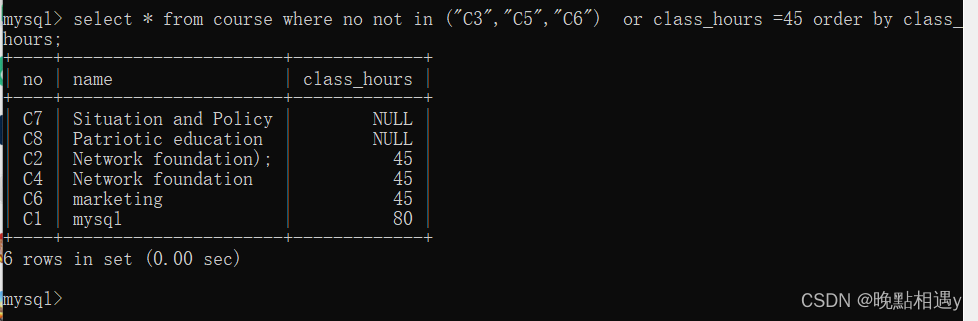 查询课程表中课程号不在C3、C5、C6中或者课时数等于45的所有字段数据,用课时数排序: