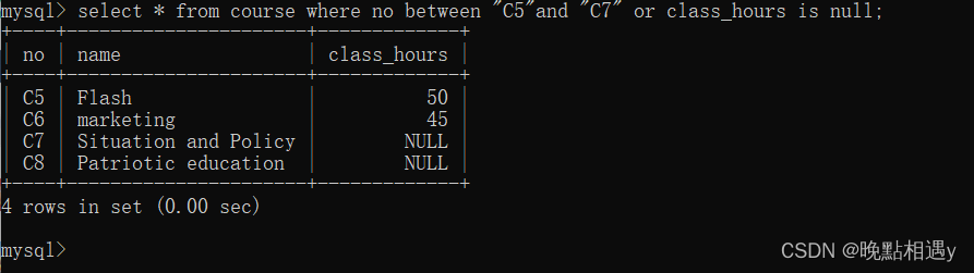 查询课程表中课程号在C5到C7之间或者没有课时数的所有字段数据: