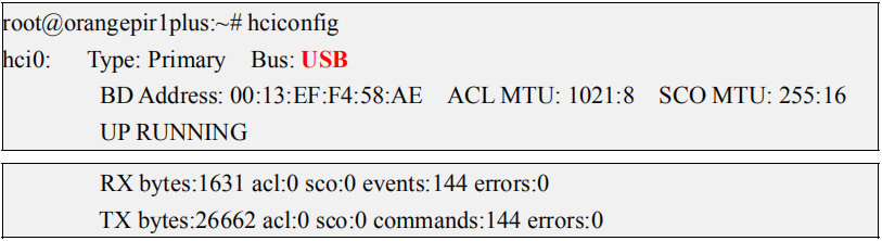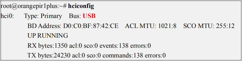 5) 然后通过 hciconfig 命令可以看到一个蓝牙设备,其中 Bus 类型为 USB 的节点就 是 RTL8723BU 的蓝牙节点,蓝牙的测试方法请参看香橙派官方对应型号使用手册的的《蓝牙测试》章节