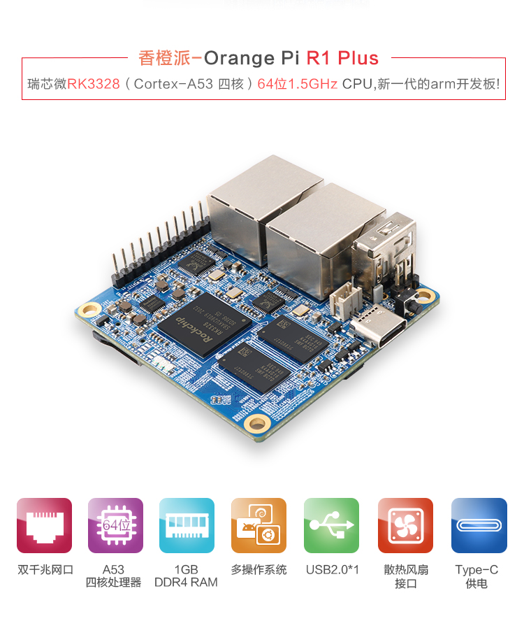 香橙派R1 Plus电脑开发板采用瑞芯微RK3328 四核64位处理器,拥有1GB DDR4内存、双千兆网口、TF卡插槽、散热风扇接口等功能接口,支持openWRT等操作系统,板子其中一个千兆网口是 USB3.0 转接的,实测转发速率能达到900MB以上,适合作为家庭路由器使用,其中,r1plus的openwrt系统已经配置好,可以直接用作路由器。