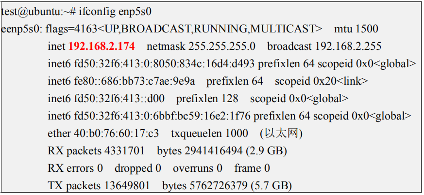 3) 在 Ubuntu PC 查看 IP 地址的命令如下