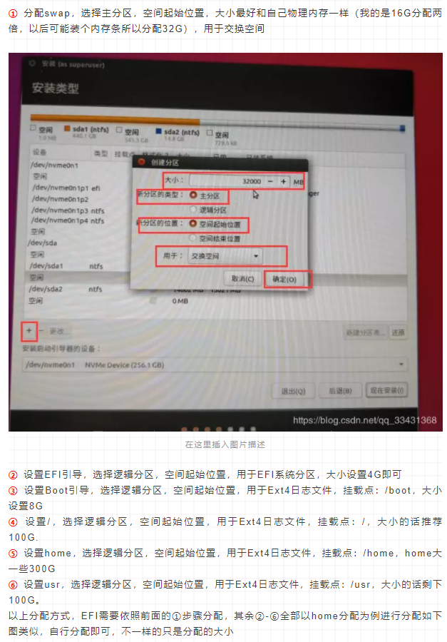 注意! 只有swap交换分区是主分区,其余均为逻辑分区,一块硬盘上最多有4个主分区,c盘一个主分区、d盘我这里也设置成了主分区。ubuntu大概分配了512G.