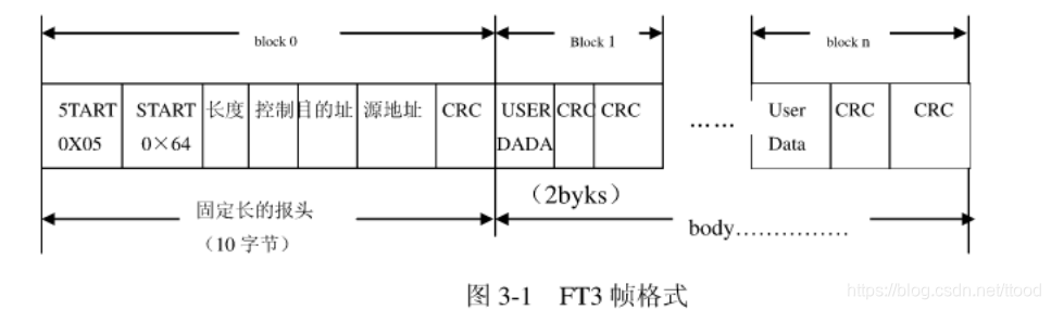 一个FT3的帧被定义为一个固定长度的报头,随之以可选用的数据块。每个数据块附有一个16位的CRC校验码。固定的报头含有2个字节的起始字,1个字节的长度,1个字节的控制字,1个16位的目的址,1个16位的源地址和1个16位的CRC校验码。