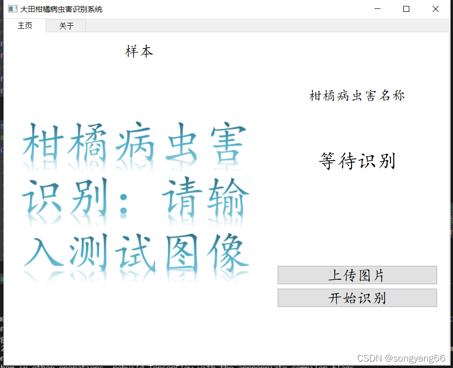import shutilclass MainWindow(QTabWidget):# 初始化def __init__(self):super().__init__()self.setWindowIcon(QIcon('images/logo.png'))self.setWindowTitle('大田柑橘病虫害识别系统') # todo 修改系统名称# 模型初始化self.model = tf.keras.models.load_model("results/mobilenet_orange.h5") # todo 修改模型名称:cnn_orange.h5、mobilenet_orange.h5、resnet_orange.h5self.to_predict_name = "images/background.jpg" # todo 修改初始图片,这个图片要放在images目录下self.class_names = ['Fruit-anthrax', 'Fruit-ulcer', 'Leaf-anthrax','Leaf-ulcer', 'leaf_thyroid'] # todo 修改类名,这个数组在模型训练的开始会输出self.resize(900, 700)self.initUI()# 界面初始化,设置界面布局def initUI(self):main_widget = QWidget()main_layout = QHBoxLayout()font = QFont('楷体', 18)# 主页面,设置组件并在组件放在布局上left_widget = QWidget()left_layout = QVBoxLayout()img_title = QLabel("样本")img_title.setFont(font)img_title.setAlignment(Qt.AlignCenter)self.img_label = QLabel()img_init = cv2.imread(self.to_predict_name)h, w, c = img_init.shapescale = 400 / himg_show = cv2.resize(img_init, (0, 0), fx=scale, fy=scale)cv2.imwrite("images/show.png", img_show)img_init = cv2.resize(img_init, (224, 224))cv2.imwrite('images/target.png', img_init)self.img_label.setPixmap(QPixmap("images/show.png"))left_layout.addWidget(img_title)left_layout.addWidget(self.img_label, 1, Qt.AlignCenter)left_widget.setLayout(left_layout)right_widget = QWidget()right_layout = QVBoxLayout()btn_change = QPushButton(" 上传图片 ")btn_change.clicked.connect(self.change_img)btn_change.setFont(font)btn_predict = QPushButton(" 开始识别 ")btn_predict.setFont(font)btn_predict.clicked.connect(self.predict_img)label_result = QLabel(' 柑橘病虫害名称 ')self.result = QLabel("等待识别")label_result.setFont(QFont('楷体', 16))self.result.setFont(QFont('楷体', 24))right_layout.addStretch()right_layout.addWidget(label_result, 0, Qt.AlignCenter)right_layout.addStretch()right_layout.addWidget(self.result, 0, Qt.AlignCenter)right_layout.addStretch()right_layout.addStretch()right_layout.addWidget(btn_change)right_layout.addWidget(btn_predict)right_layout.addStretch()right_widget.setLayout(right_layout)main_layout.addWidget(left_widget)main_layout.addWidget(right_widget)main_widget.setLayout(main_layout)# 关于页面,设置组件并把组件放在布局上about_widget = QWidget()about_layout = QVBoxLayout()about_title = QLabel('欢迎使用柑橘病虫害识别系统') # todo 修改欢迎词语about_title.setFont(QFont('楷体', 18))about_title.setAlignment(Qt.AlignCenter)about_img = QLabel()about_img.setPixmap(QPixmap('images/bj.jpg'))about_img.setAlignment(Qt.AlignCenter)label_super = QLabel("作者:宋扬") # todo 更换作者信息label_super.setFont(QFont('楷体', 15))# label_super.setOpenExternalLinks(True)label_super.setAlignment(Qt.AlignRight)about_layout.addWidget(about_title)about_layout.addStretch()about_layout.addWidget(about_img)about_layout.addStretch()about_layout.addWidget(label_super)about_widget.setLayout(about_layout)# 添加注释self.addTab(main_widget, '主页')self.addTab(about_widget, '关于')self.setTabIcon(0, QIcon('images/主页面.png'))self.setTabIcon(1, QIcon('images/关于.png'))# 上传并显示图片def change_img(self):openfile_name = QFileDialog.getOpenFileName(self, 'chose files', '','Image files(*.jpg *.png *jpeg)') # 打开文件选择框选择文件img_name = openfile_name[0] # 获取图片名称if img_name == '':passelse:target_image_name = "images/tmp_up." + img_name.split(".")[-1] # 将图片移动到当前目录shutil.copy(img_name, target_image_name)self.to_predict_name = target_image_nameimg_init = cv2.imread(self.to_predict_name) # 打开图片h, w, c = img_init.shapescale = 400 / himg_show = cv2.resize(img_init, (0, 0), fx=scale, fy=scale) # 将图片的大小统一调整到400的高,方便界面显示cv2.imwrite("images/show.png", img_show)img_init = cv2.resize(img_init, (224, 224)) # 将图片大小调整到224*224用于模型推理cv2.imwrite('images/target.png', img_init)self.img_label.setPixmap(QPixmap("images/show.png"))self.result.setText("等待识别")# 预测图片def predict_img(self):img = Image.open('images/target.png') # 读取图片img = np.asarray(img) # 将图片转化为numpy的数组outputs = self.model.predict(img.reshape(1, 224, 224, 3)) # 将图片输入模型得到结果result_index = int(np.argmax(outputs))result = self.class_names[result_index] # 获得对应的水果名称self.result.setText(result) # 在界面上做显示# 界面关闭事件,询问用户是否关闭def closeEvent(self, event):reply = QMessageBox.question(self,'退出',"是否要退出程序?",QMessageBox.Yes | QMessageBox.No,QMessageBox.No)if reply == QMessageBox.Yes:self.close()event.accept()else:event.ignore()if __name__ == "__main__":app = QApplication(sys.argv)x = MainWindow()x.show()sys.exit(app.exec_())