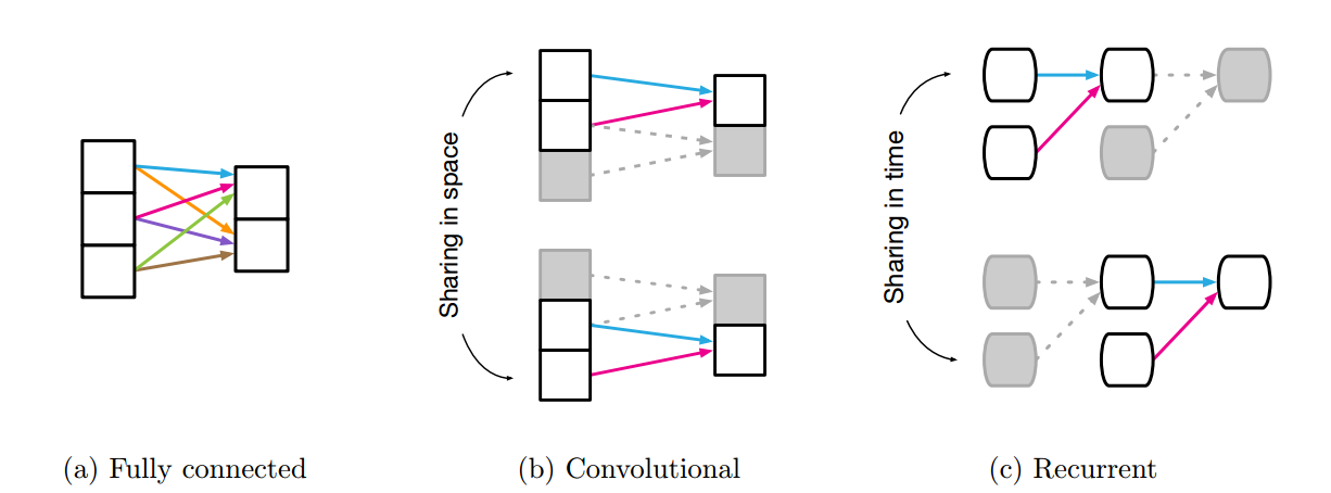 图1:常见的深度学习构建块中的重用和共享。(a)全连接层,所有的权重都是独立的,没有共享(b)卷积层,局部核函数在输入中被重用多次,共享的权重由相同颜色的箭头表示©循环层,相同的激活函数在不同的处理步骤中重用。