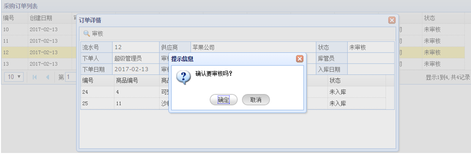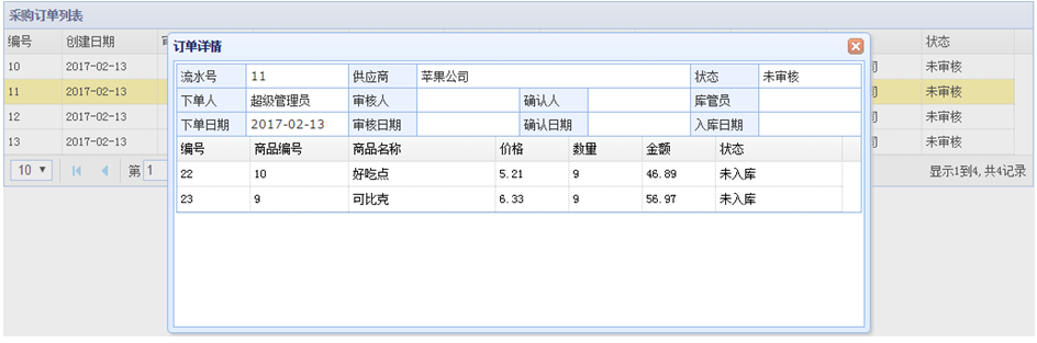 需求:列出所有“未审核”的采购订单,双击某一行时弹出详细窗口,点击“审核”按钮后弹出确认框,确认后提示“审核”结果。审核成功,则关闭详细窗口并刷新“未审核”列表。如下图
