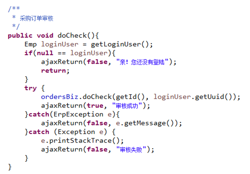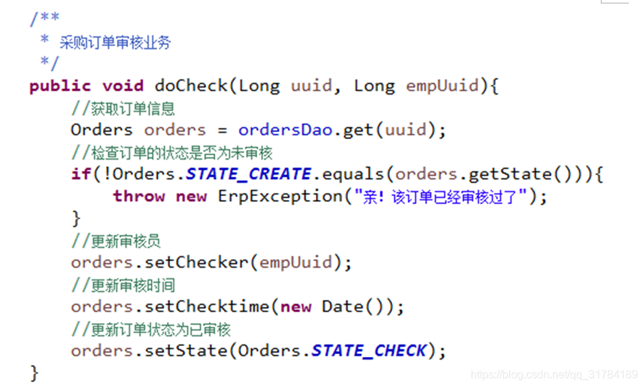 业务OrdersBiz添加doCheck方法,用来修改订单的状态state,同时设置审核人,审核时间