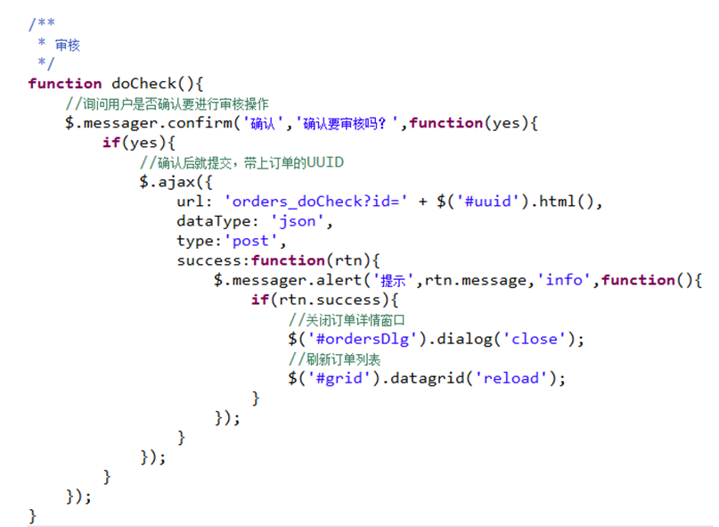 OrdersAction添加请求调用方法doCheck,接收订单编号,调用审核业务,返回审核结果给前端