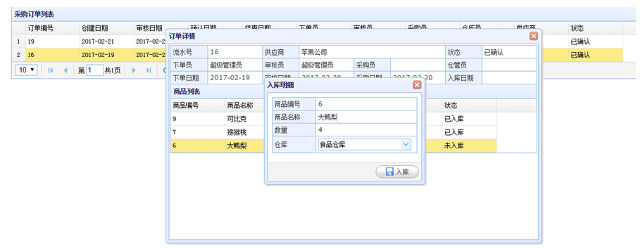 分析:订单入库的列表里只显示已确认的订单,即订单的state=2。双击某一行后可以弹出的窗口中看到订单的明细,双击明细中的某一行弹出窗口,显示订单商品明细信息,包括商品编号、名称、数量和自己管理的仓库下拉列表。选择仓库后确认,则将此商品入库,入库后更新明细记录的状态。