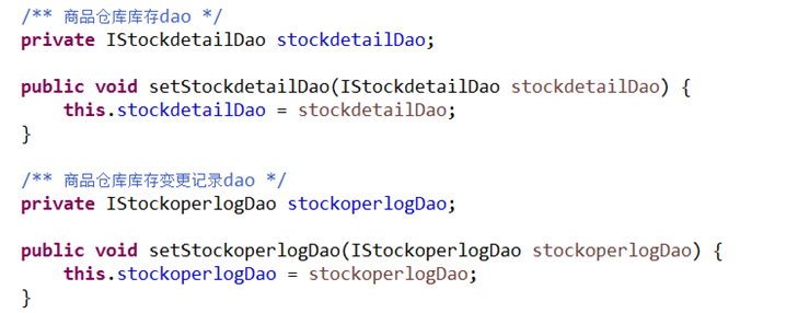 我们要更新或增加商品仓库库存数量,要用到对应原数据访问,因此需要添加StockdetailDao的引用;要记录“商品仓库库存变更记录”,我们也要添加StockoperlogDao的引用