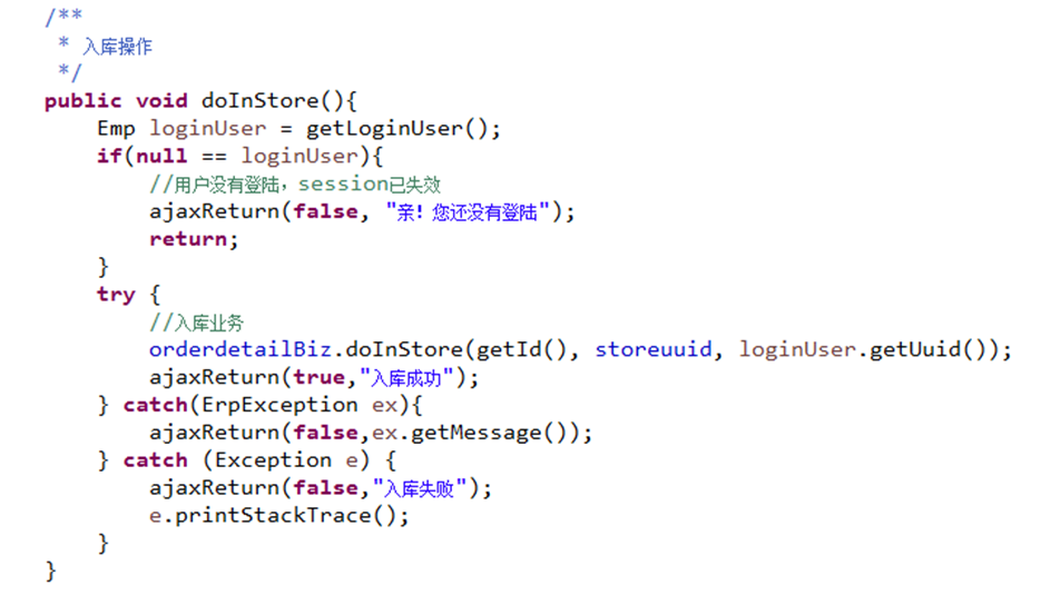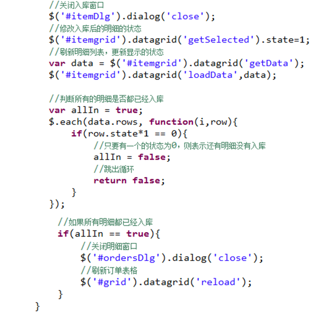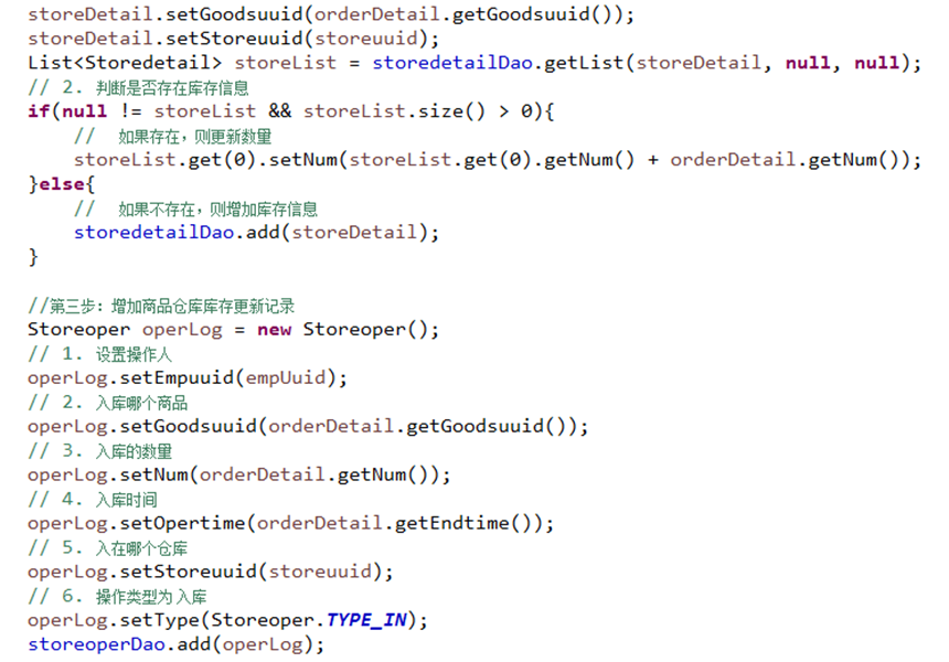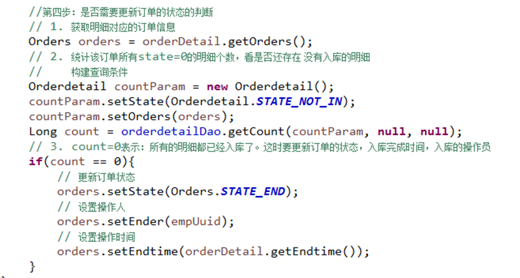4) 检查是否需要更新订单的状态的判断。检查订单下所有的明细是否都已经入库了,如果都入库了则需要更新订单的状态为3(已入库),同时设置 入库时间、入库操作人