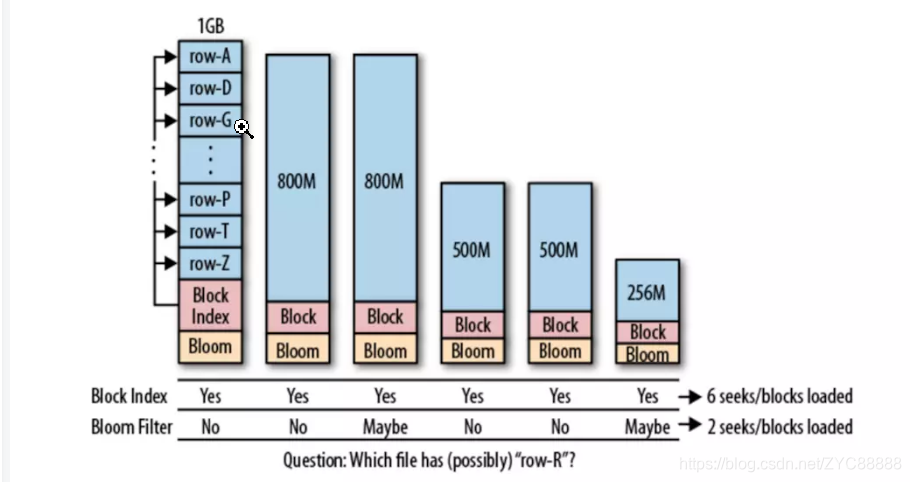但实际应用中,仅仅只有块索引满足不了需求,这是因为,块索引能帮助我们更快地在一个文件中找到想要的数据,但是我们可能依然需要扫描很多文件。而布隆过滤器就是为解决这个问题而生。因为布隆过滤器的作用是,用户可以立即判断一个文件是否包含特定的行键,从而帮我们过滤掉一些不需要扫描的文件。如下图所示,块索引显示每个文件中都可能包含对应的行键,而布隆过滤器能帮我们跳过一些明显不包含对应行键的文件。