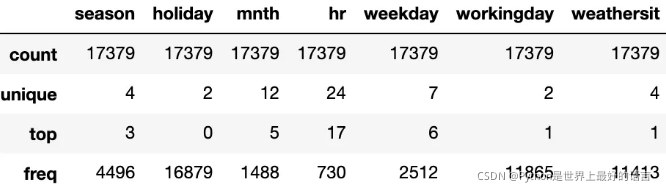 fullData = dataloader.getFullData()category_features = ['season', 'holiday', 'mnth', 'hr', 'weekday', 'workingday', 'weathersit']