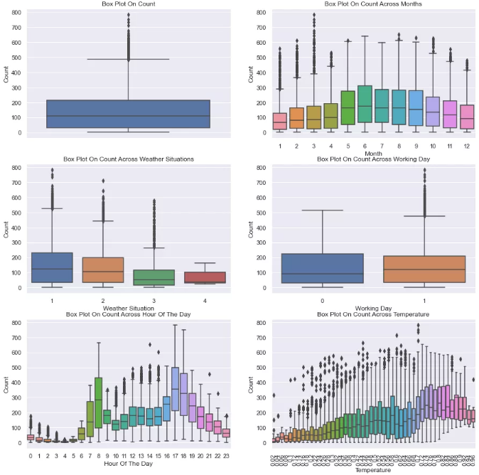 sns.set(font_scale=1.0) fig, axes = plt.subplots(nrows=3,ncols=2) fig.set_size_inches(15, 15) sns.boxplot(data=train,y="cnt",orient="v",ax=axes[0][0]) sns.boxplot(data=train,y="cnt",x="mnth",orient="v",ax=axes[0][1]) sns.boxplot(data=train,y="cnt",x="weathersit",orient="v",ax=axes[1][0]) sns.boxplot(data=train,y="cnt",x="workingday",orient="v",ax=axes[1][1]) sns.boxplot(data=train,y="cnt",x="hr",orient="v",ax=axes[2][0]) sns.boxplot(data=train,y="cnt",x="temp",orient="v",ax=axes[2][1])axes[0][0].set(ylabel='Count',title="Box Plot On Count") axes[0][1].set(xlabel='Month', ylabel='Count',title="Box Plot On Count Across Months") axes[1][0].set(xlabel='Weather Situation', ylabel='Count',title="Box Plot On Count Across Weather Situations") axes[1][1].set(xlabel='Working Day', ylabel='Count',title="Box Plot On Count Across Working Day") axes[2][0].set(xlabel='Hour Of The Day', ylabel='Count',title="Box Plot On Count Across Hour Of The Day") axes[2][1].set(xlabel='Temperature', ylabel='Count',title="Box Plot On Count Across Temperature")for tick in axes[2][1].get_xticklabels():tick.set_rotation(90)