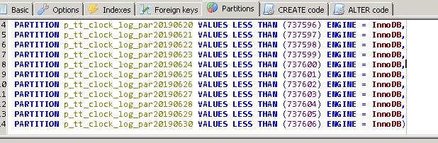 PARTITION p_tt_clock_log_par20190610 VALUES LESS THAN (737573) ENGINE = InnoDB) */;